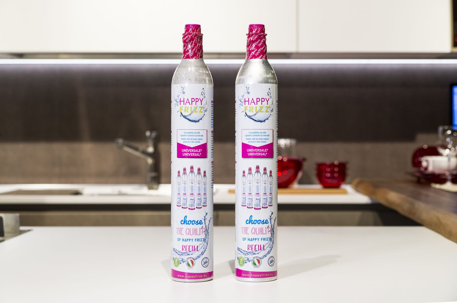 Happy Frizz offers a 425g CO2 Cylinder for Water Carbonators, featuring a universal screwing design compatible with all soda machines, except Terra, Art, and Duo Sodastream models, which support quick connect coupling. Each cylinder can make up to 60L of sparkling water.