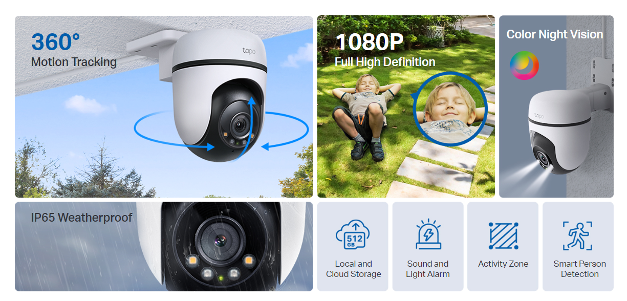 360° All-Round Protection: Provides 360° horizontal & 130° vertical viewing range, eliminating blind spots. Person Detection: Smart AI identifies a person accurately, sending instant notifications through the Tapo app. 1080P Full HD: Capture more details to make every moment shine. Color Night Vision: Capture virant color night vision up to 30 meters away. IP65 Weatherproof: Tapo C500 is protected against jets of water and dust. Sound and Light Alarm: Activate the integrated siren along with the spotlight alarm to deter unwelcomed intruders. Local and Cloud Storage: Save all your important moments to a microSD card1 (up to 512GB) or subscribe to Tapo Care2 for cloud service.
