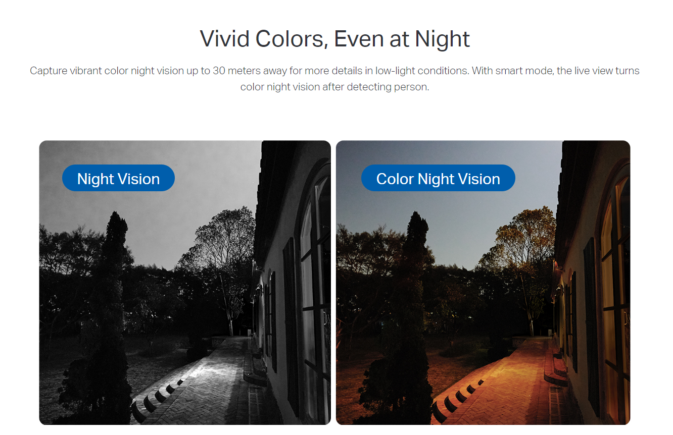 • Color Night Vision: Capture virant color night vision up to 30 meters away.