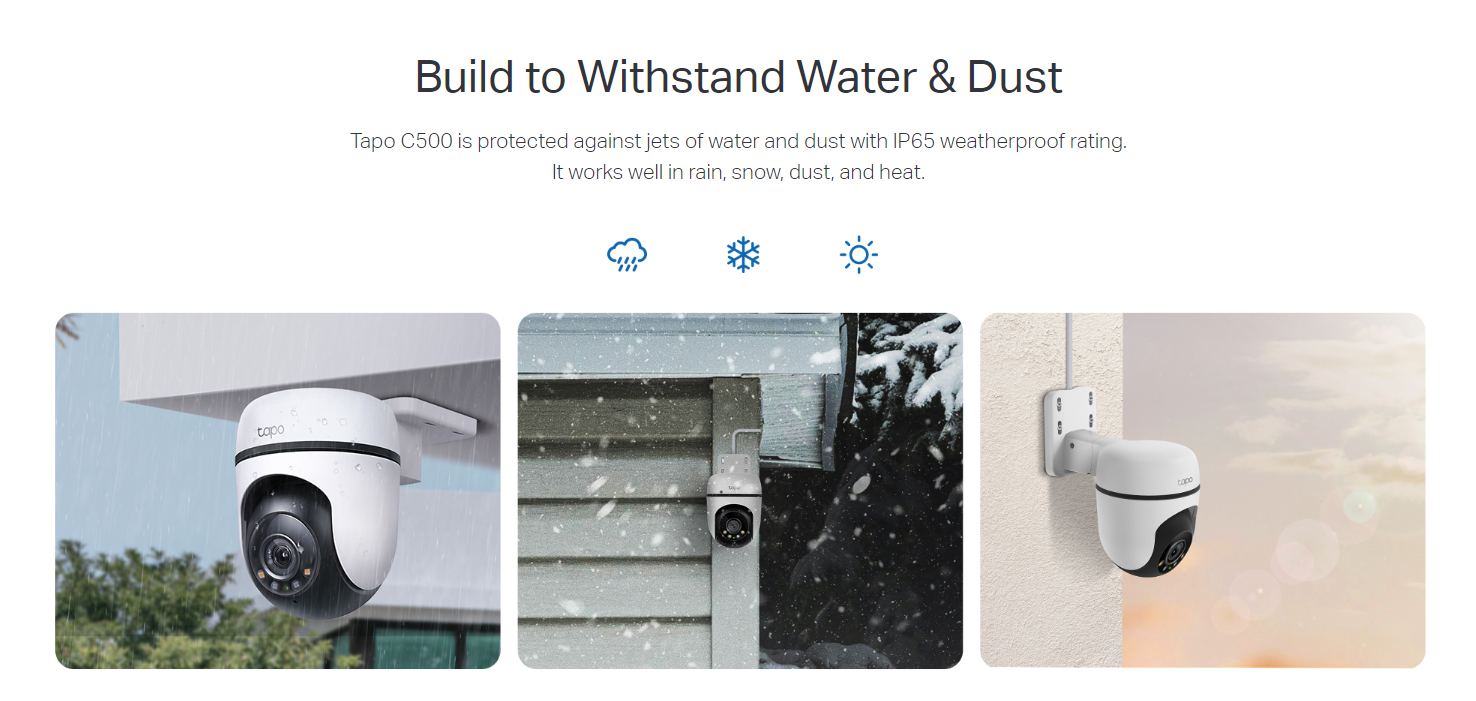 • IP65 Weatherproof: Tapo C500 is protected against jets of water and dust.