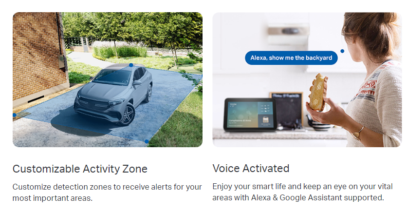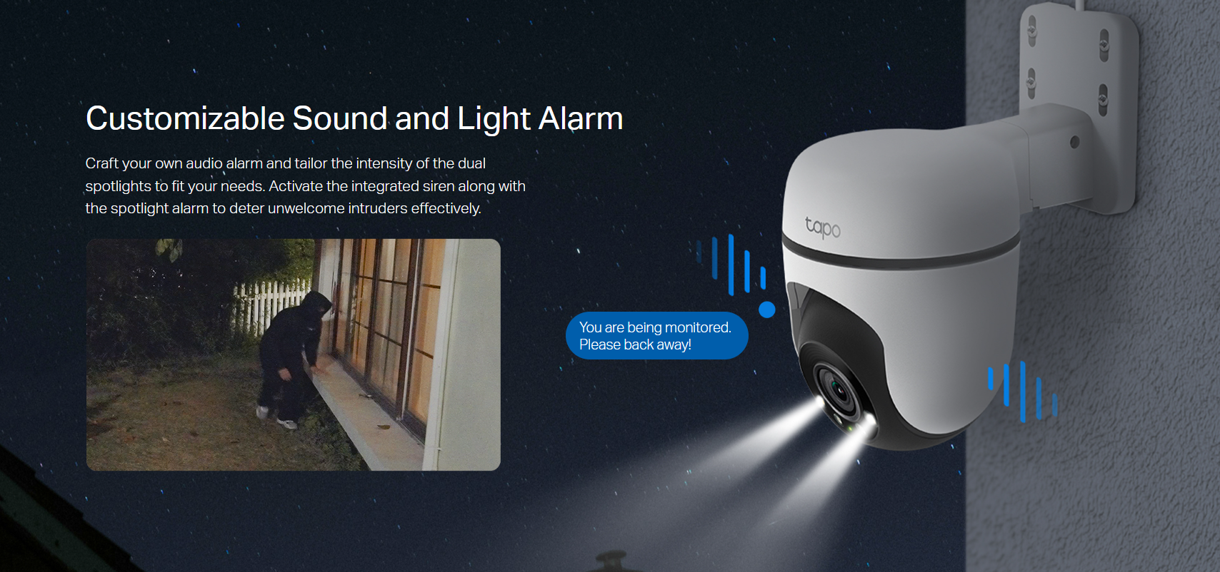 • Sound and Light Alarm: Activate the integrated siren along with the spotlight alarm to deter unwelcomed intruders.