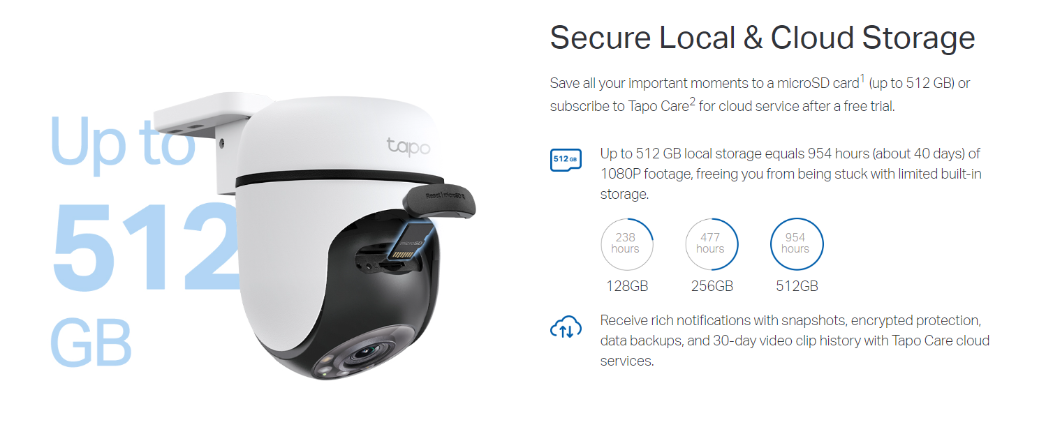 • Local and Cloud Storage: Save all your important moments to a microSD card1 (up to 512GB) or subscribe to Tapo Care2 for cloud service.