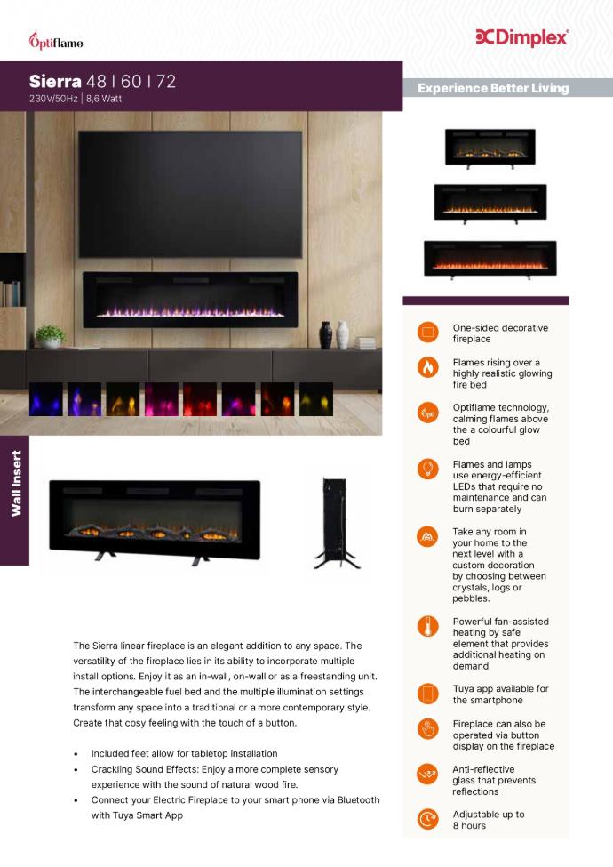 The Sierra linear fireplace is an elegant addition to any space. The versatility of the fireplace lies in its ability to incorporate multiple install options. Enjoy it as an in-wall, on-wall or as a freestanding unit. The interchangeable fuel bed and the multiple illumination settings transform any space into a traditional or a more contemporary style. Create that cosy feeling with the touch of a button.