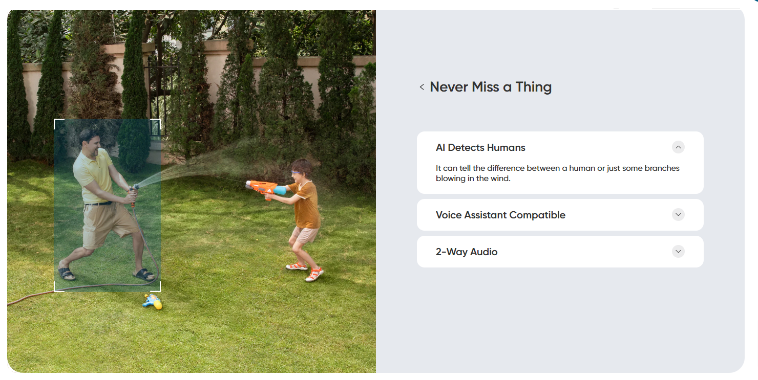 Human Detection: AI alerts you of anyone in your yard, whether family, a courier, or a stranger. Connect to HomeBase 3 for individual facial recognition.
