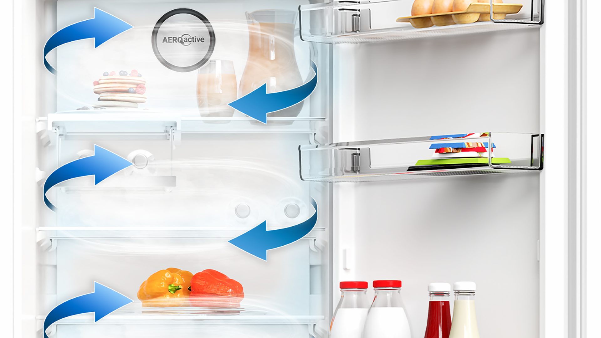 Blomberg’s AeroActive cooling system minimises temperature fluctuations, ensuring even cold air distribution within the fridge and between shelves, evenly circulating cold air to keep your food fresher for longer.