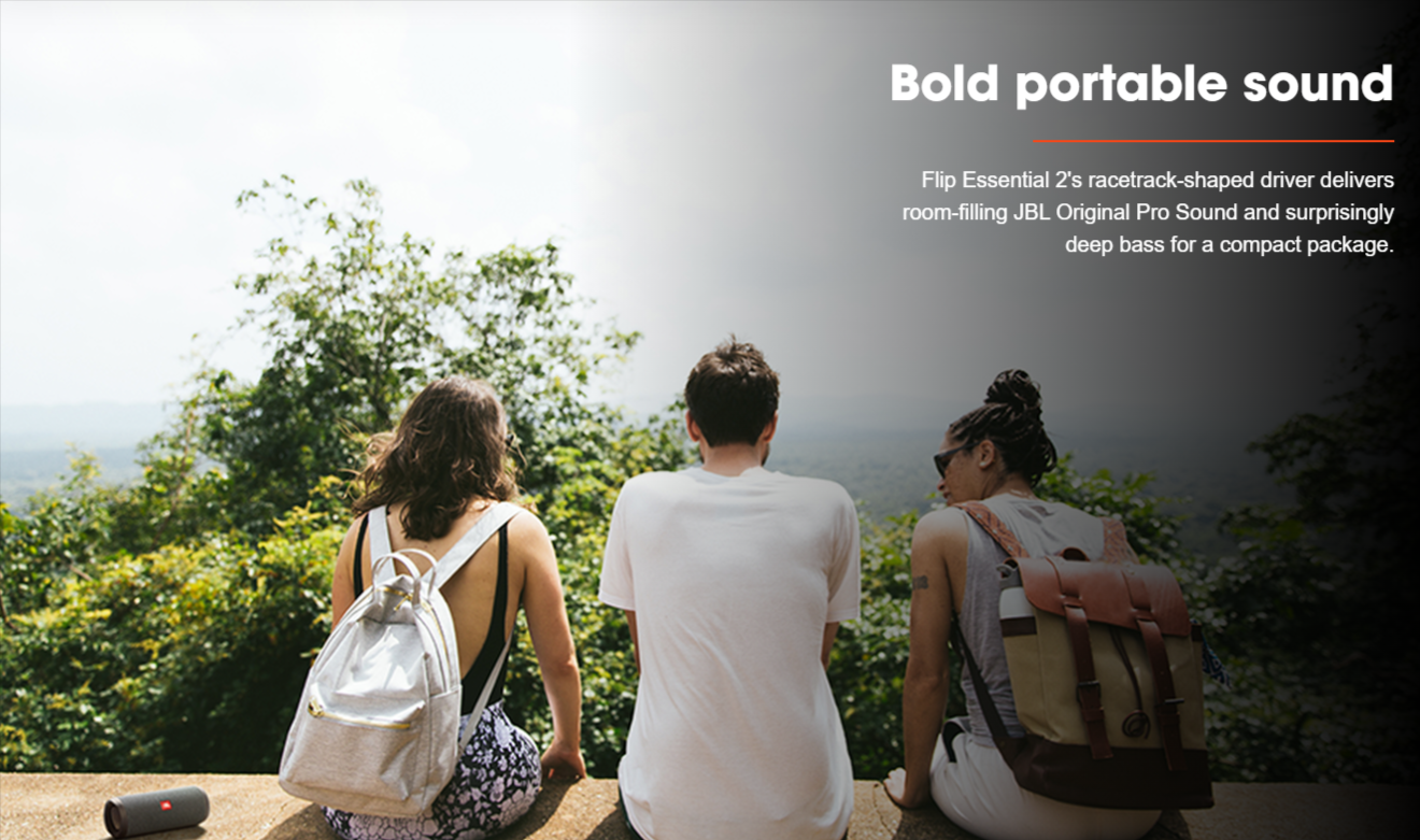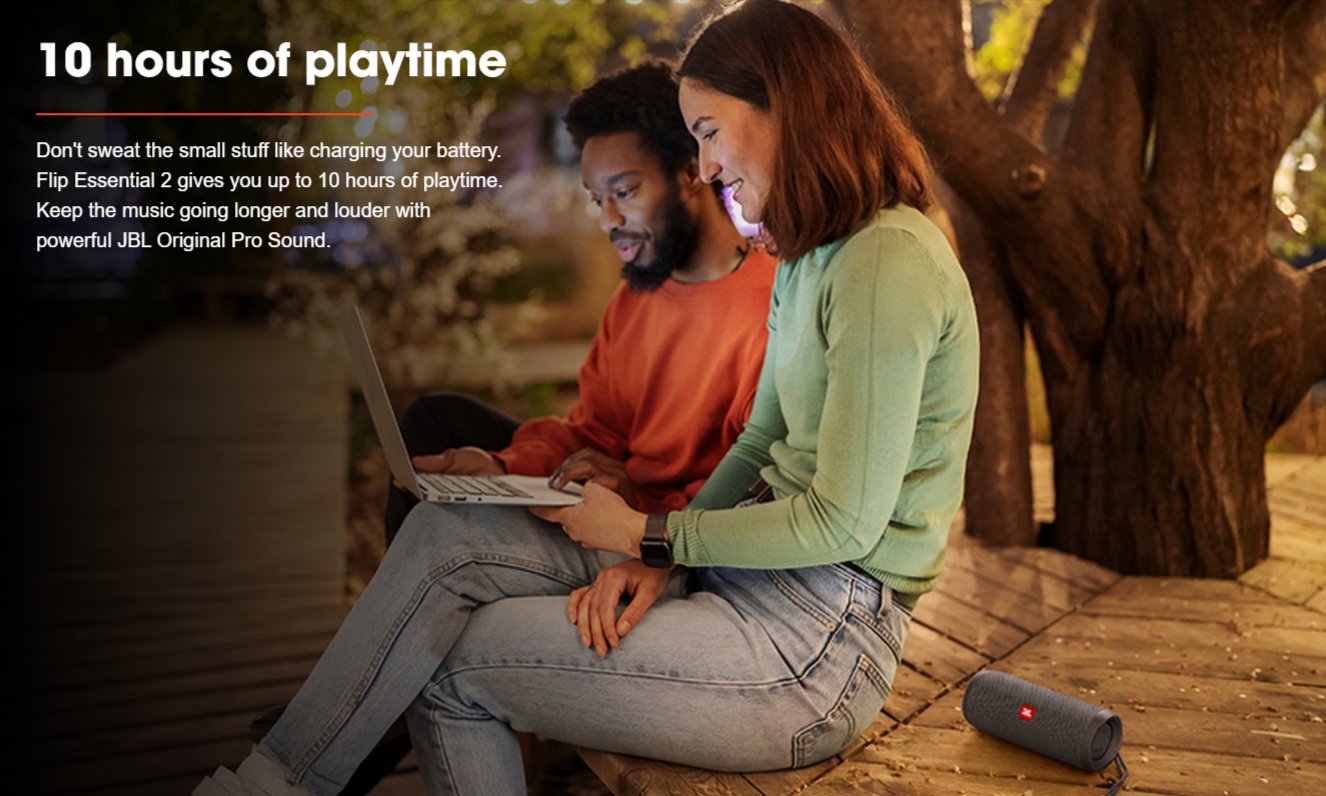 Take your tunes on the go with the powerful JBL Flip Essential 2. Our lightweight Bluetooth speaker goes anywhere. Bad weather? Not to worry. With its waterproof design, you can rock out to our JBL Original Pro Sound rain or shine. Enjoy up to 10 hours of playtime for your favorite music.