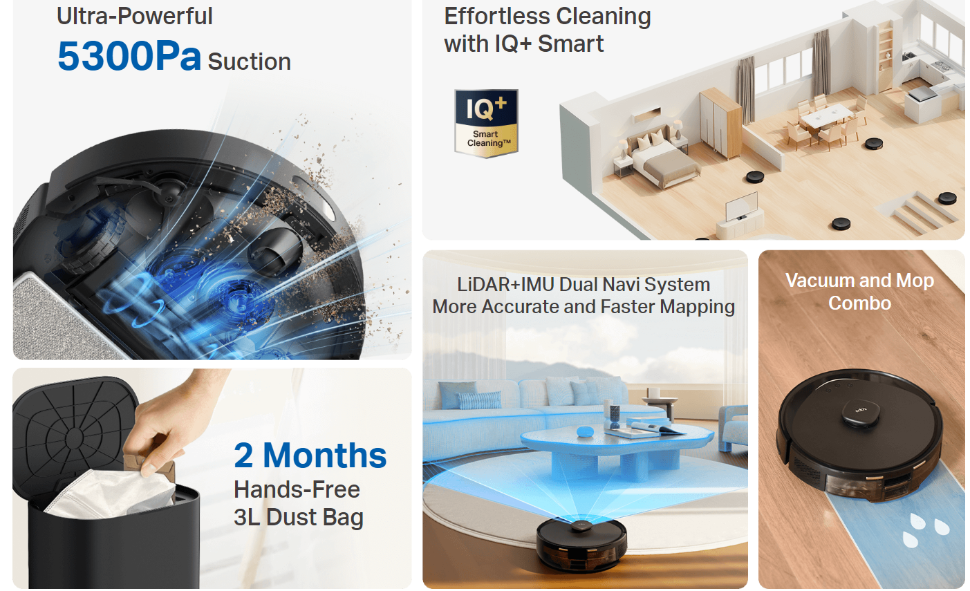 - LiDAR+IMU Dual Navigation System - Accurately maps out your house in minutes, avoids omissions and repeated cleaning, and even works well in the dark.