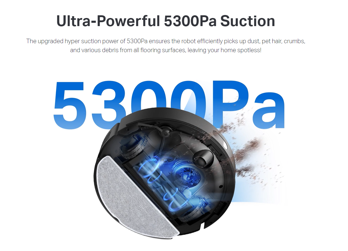 - Ultra-Powerful 5300Pa Suction - Ensures the robot efficiently picks up dust, pet hair, crumbs, and various debris from all flooring surfaces, leaving your home spotless.
