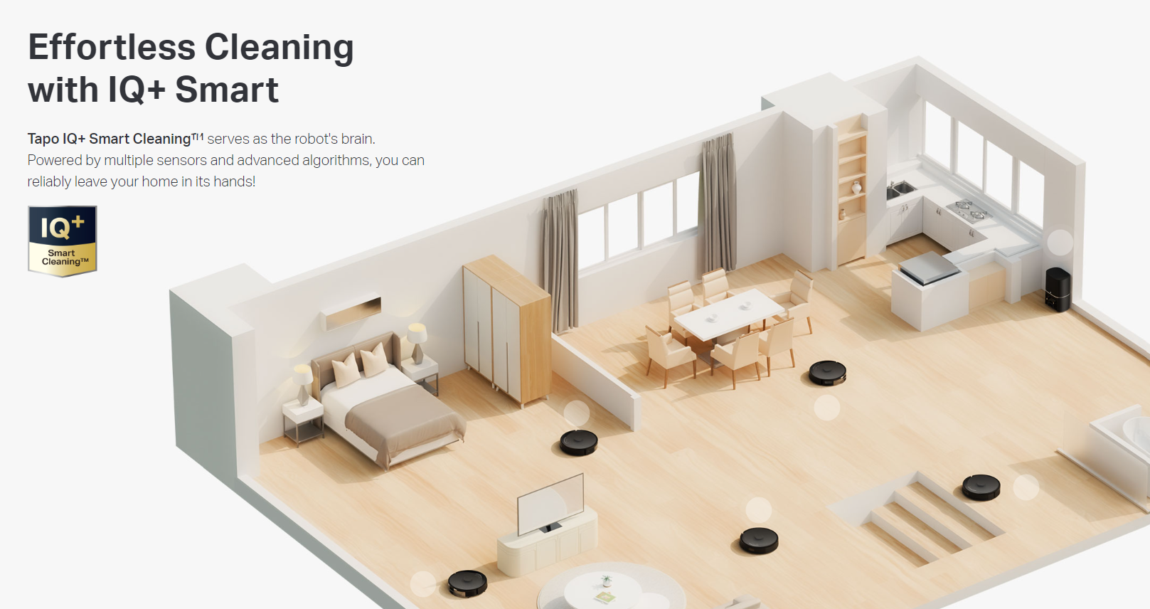 - Tapo IQ+ Smart Cleaning™ - Serves as the robot's brain. Powered by multiple sensors and advanced algorithms, you can reliably leave your home in its hands.