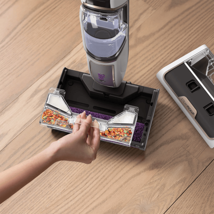 Captures as you steam, so no need to sweep. Whether it’s wet, dry, or stuck-on debris, Shark SteamPickUp takes it all in stride. By capturing and collecting debris as you steam, there’s no need to sweep—you can tackle it all in one fell swoop.