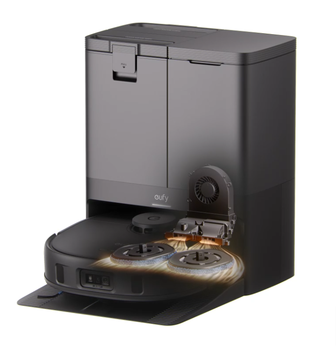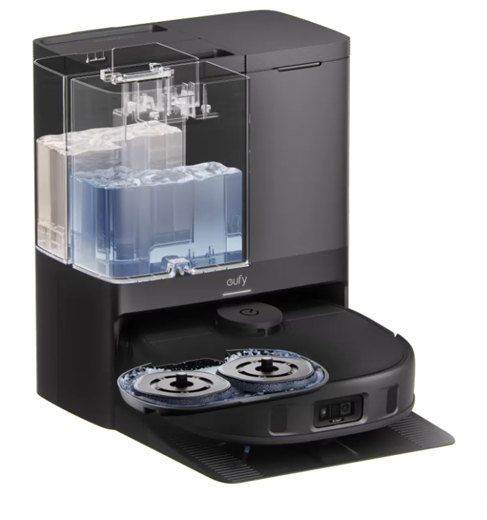 X10 Pro Omni returns to the station to wash it's mop pads using clean water.
