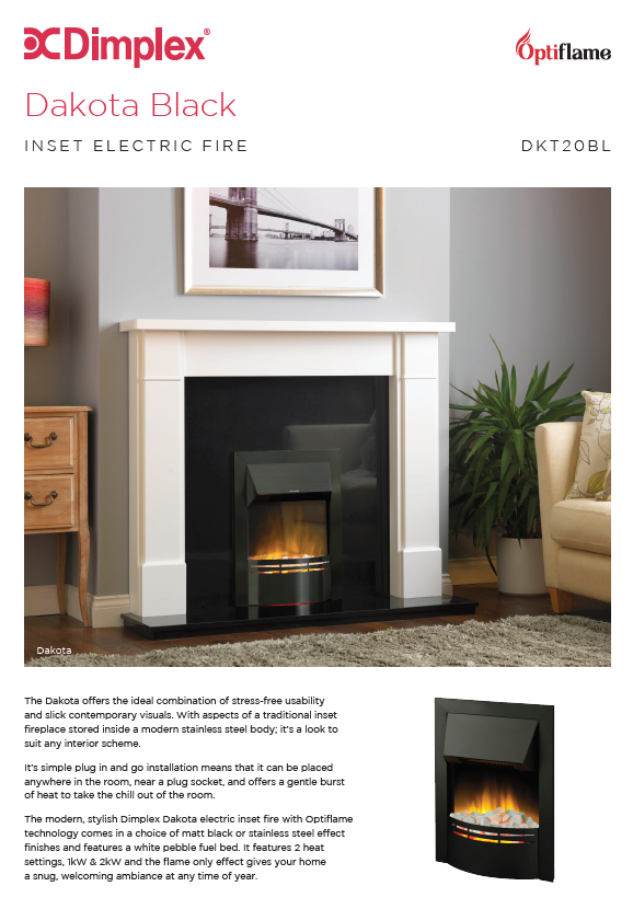 The modern, stylish Dimplex Dakota electric inset fire with Optiflame technology comes in a choice of matt black or stainless steel effect finishes and features a white pebble fuel bed. It features 2 heat settings, 1kW & 2kW and the flame only effect gives your home a snug, welcoming ambiance at any time of year.