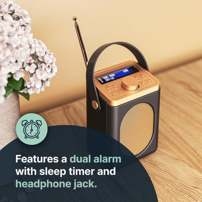 Our portable Radio with Bluetooth, in a classic-looking, vintage design. The Little Shelford – includes DAB, DAB+ and FM radio. Designed with portability in mind, the Little Shelford can be both mains and battery powered (insert 4x AA batteries), with a leather-look carry handle to grab-and-go. The Little Shelford comes with a handy preset function so you can save and search your favourite stations with ease. It also features a DAB radio alarm clock, sleep timer and headphone jack.